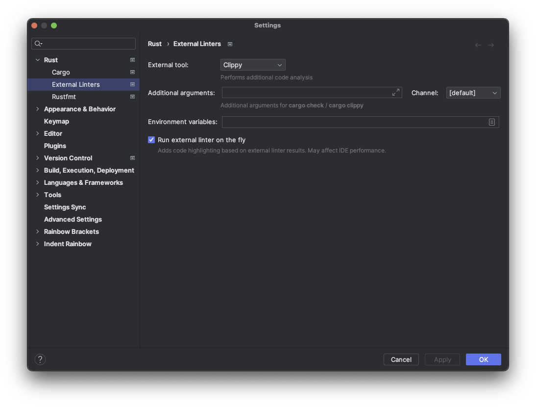 - RustRover/Intellij Rust で linter による即時チェック機能はデフォルトでオフになっているが、無いと生産性がガタ落ちするので設定を変えておいたほうが良い